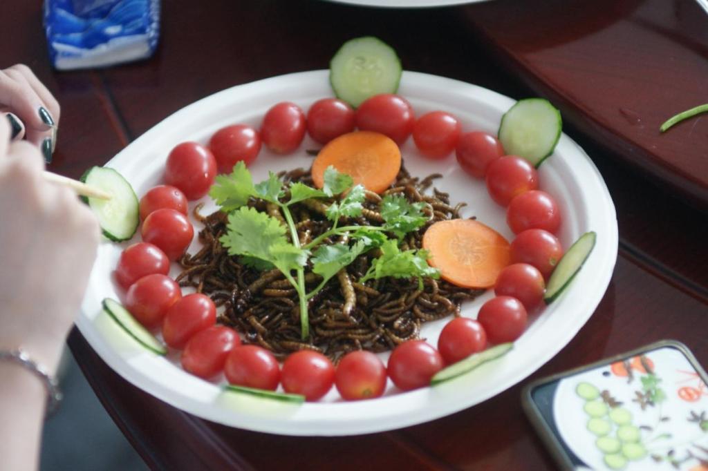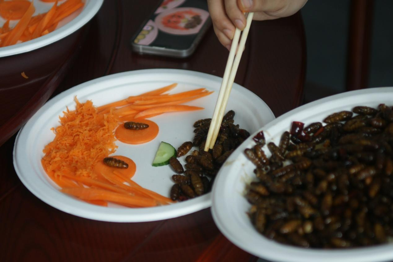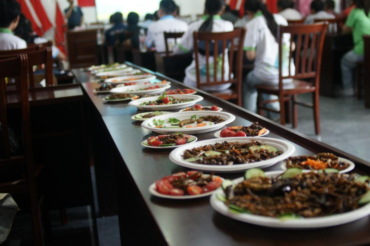 据介绍,昆虫宴起源于云南的昆虫食法,大多采取油炸方式,不仅入口酥香,而且去除腥味,是下酒的好菜;除此之外,昆虫的营养丰富,具有美容强身的功效。经过一段时间的交流后,华中农业大学实践队队员们也积极参与到昆虫宴的制作中来,在两校学子的共同努力下,一盘盘装点精美的昆虫美食很快被制作而成,香飘四溢,造型童趣且不失深度。