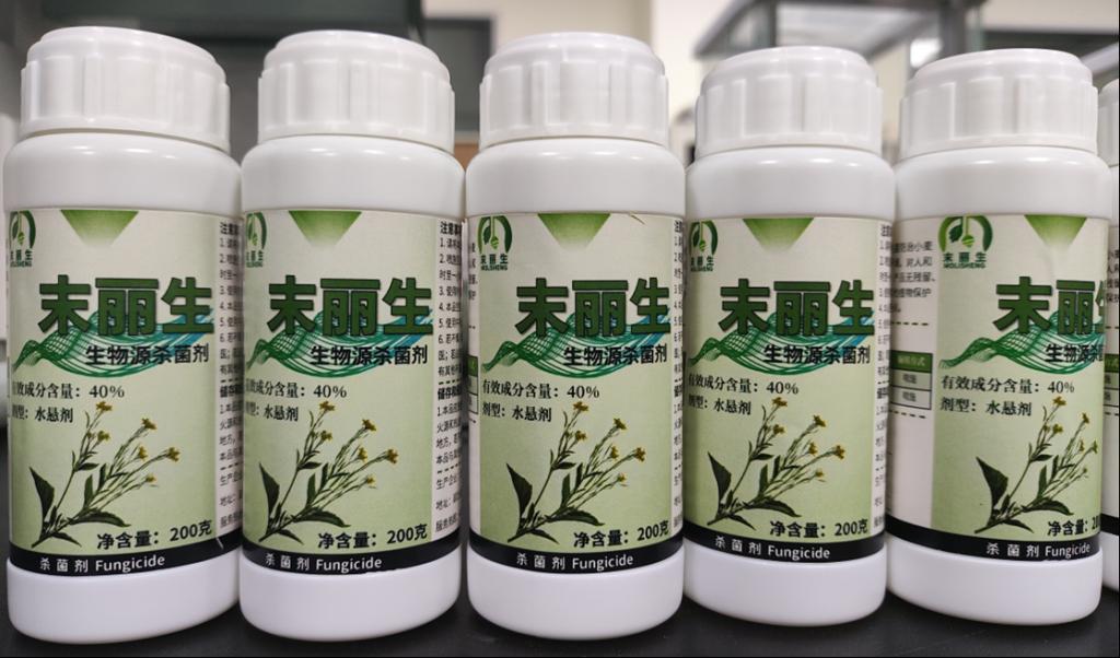 “末丽生”由芥菜鲜物质制成,相比于残留量大、污染严重的传统化学农药,本产品绿色环保,保障生物安全;本生物农药采用高分子水凝胶封装技术,具有高粘附性,高效抗冲刷,减少传统化学农药雨后补喷的工作,增长药效持续时间;同时,该生物农药可以促进小麦生长,提高作物产量,是一款高抗冲刷生物源杀菌剂。