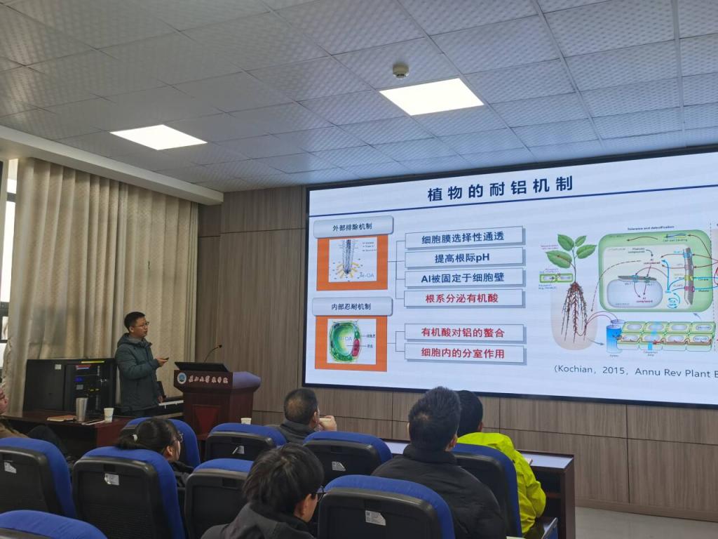 车景研究员长期致力于植物在酸性土壤条件下的适应性机理以及水稻矿质元素分配机制的研究。报告伊始,车研究员以全国酸性土壤分布的广泛性及其对农业生产的重大影响为切入点,深入浅出地阐述了研究植物适应酸性土壤逆境的紧迫性和重要性。他指出,酸性土壤中的铝毒与低养分利用效率极大限制农作物生长、产量及品质,剖析作物应对胁迫分子机制对于培育耐酸性土壤作物新品种、提高酸性土壤地区农业生产力具有极为关键的意义。