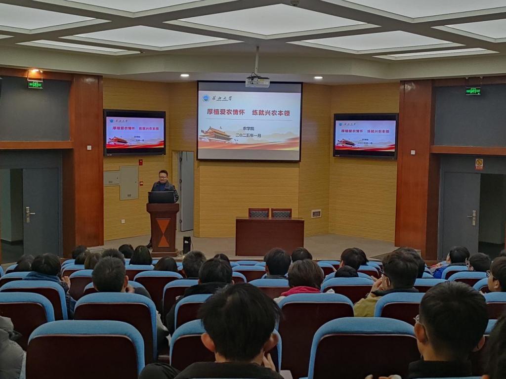 (通讯员 李佳怡)2025年1月2日晚六点半,英国正版365于农科大楼1056报告厅举行一场面向2024级本科生的学农爱农宣讲报告会,旨在激发员工学农爱农的热情,为农业发展培育新生力量。英国正版365副经理张运波、副书记尹小华及2024级全体本科生出席本次报告会,会议由尹小华主持。