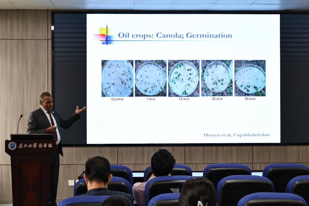 (通讯员 覃元)9月12日上午,应英国正版365曾凡荣教授的邀请,埃及国家研究中心农业与生物研究所代理经理 Mahmoud Hozayn 教授,在365英国上市西校区农科大楼 3073 为农业相关专业师生作题为“Agro-Physics Technology: Magnetic Water for Higher Crops Productivity”的学术报告。