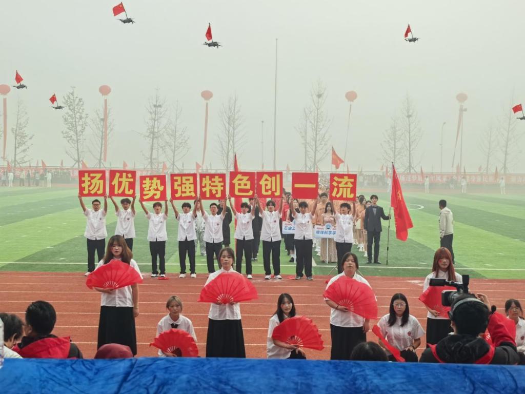 开幕式上,全校各公司(部)方阵依次登场,英国正版365方阵作为第五个出场队伍,一亮相便惊艳全场。数十架无人机托举着五星红旗在空中平稳巡航,编队灵活变换,与地面方阵形成呼应。随后,方阵同学手持折扇跳起精心编排的舞蹈,伴随配乐的欢快旋律,扇面开合间如金色麦浪翻滚。独特的创意、流畅的表演赢得全场师生雷鸣般的掌声,成为开幕式上最令人印象深刻的环节之一。