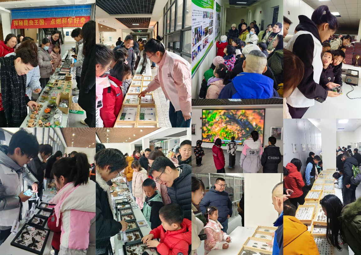 活动开始前,在植物保护系谢广林老师的指导下,员工团队高效完成了场地布置。农科楼大厅内,10个主题摊位错落有致,共同构筑了一个丰富多彩的“昆虫集市”,依次展示了精品昆虫标本、常见农业害虫生活史标本、昆虫标本馆主题文创、自然博物社特色周边、自制昆虫艺术品,以及多肉植物等琳琅满目的内容。在农科大楼大厅的大屏幕上,滚动播放着历届植保专业技能大赛中公司代表队的获奖短视频作品。与此同时,报告厅完成设备调试,农科楼内外显示屏准备就绪,标本馆内标本整理妥当,为活动开展做好了全面准备。