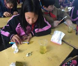 训练营成员分组认真指导员工清洗树叶、分离叶脉。经过将近半个小时的努力,所有同学都成功地梳理出叶脉,训练营成员给所有叶脉都进行了染色和过塑,一枚枚漂亮又独具个人特色的书签制作完成了。