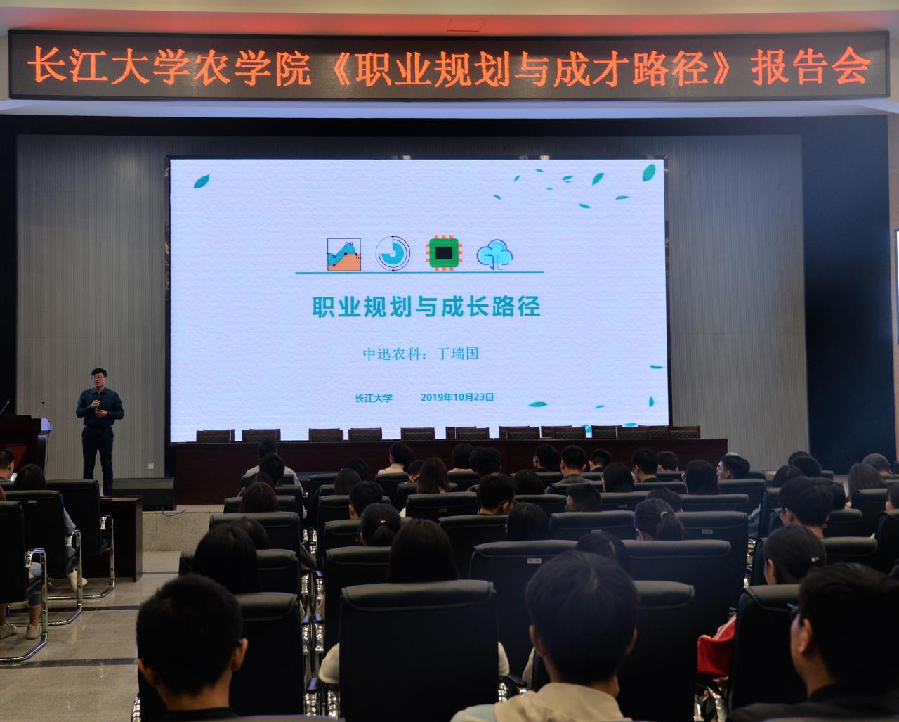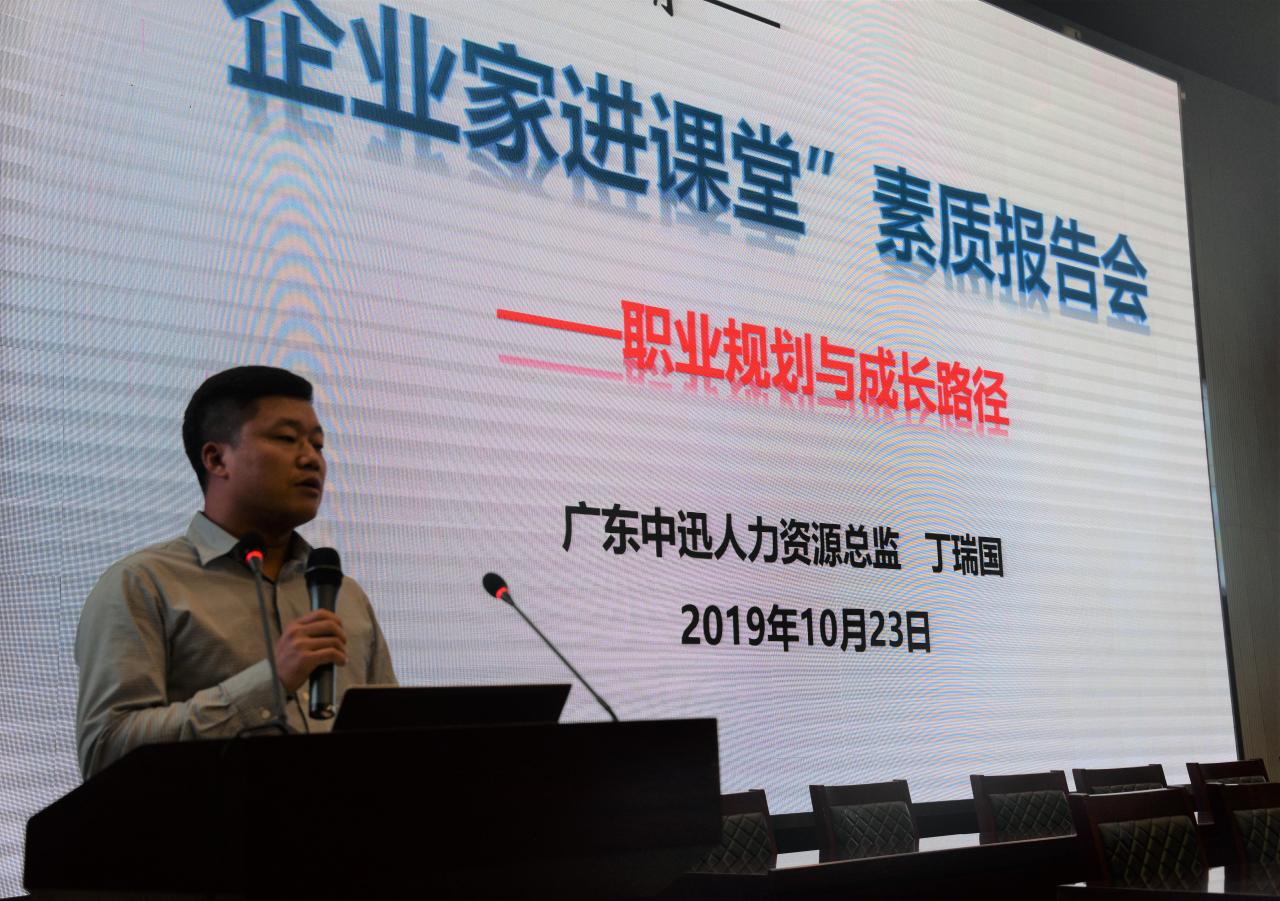 新闻网讯(见习记者 李建平)为帮助在校老员工树立正确的职业规划目标。10月23日19:30,公司于农科大楼1058报告厅举行《职业规划与成才路径》报告会。参与此次报告会的企业嘉宾有中迅集团人力资源中心总监丁瑞国、营销总监熊辉、人力资源中心部长胡诚及招聘主管黄谨。此外,党委副书记谭亮魁,辅导员吴钐、万钰、付雪娇及18、19级全体同学也参与了此次报告会。