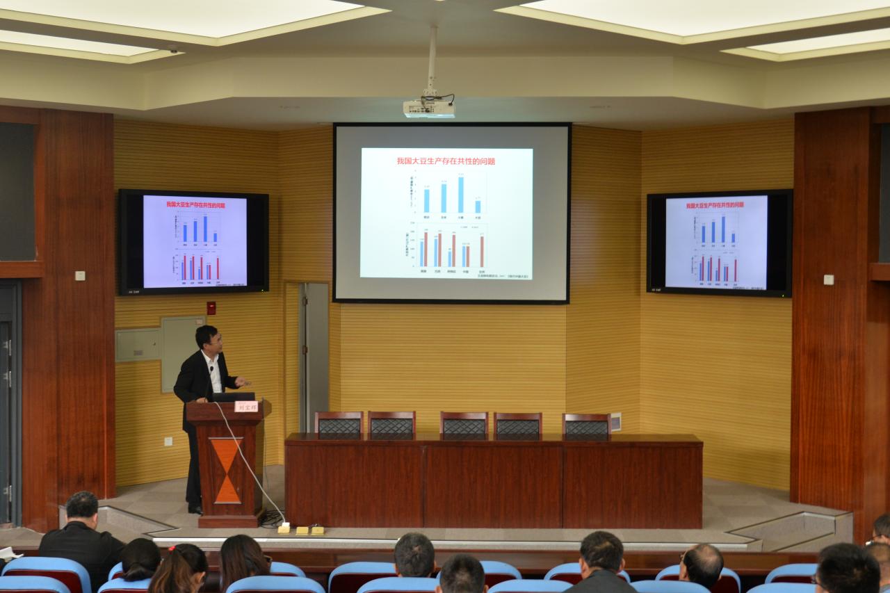 会议伊始,李俊凯经理对本次主讲人刘宝辉教授作了详细的介绍并表示热烈欢迎。刘教授由大豆保障我国粮油安全的重要性引入本次报告会主题。会议上,他介绍单株荚数是决定大豆产量的关键因子之一,而每节荚数由落花率决定。大豆种植区(东北大豆、黄淮海大豆和南方大豆)域存着的问题主要是早熟低产。