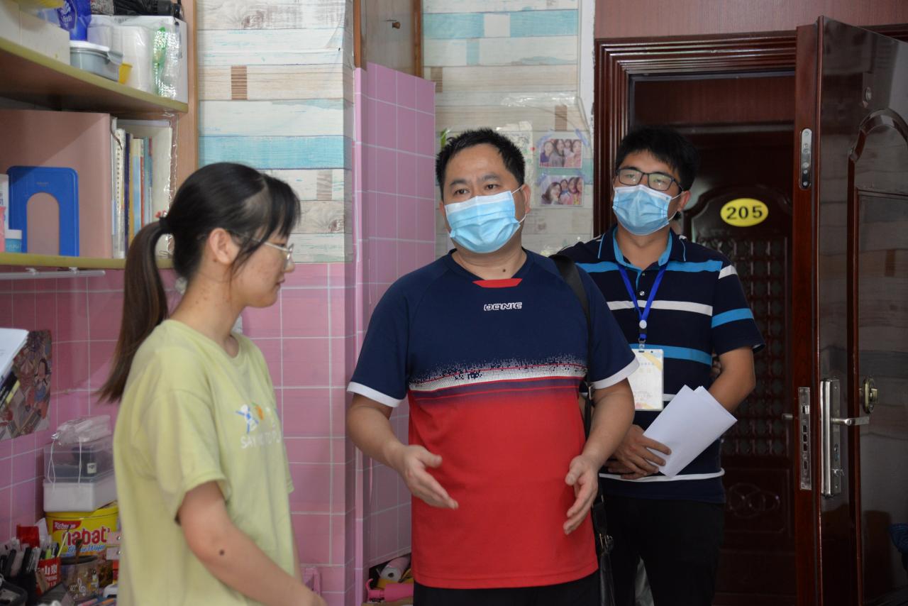 通讯社讯(员工记者 覃杨)为进一步强化疫情防控期间返校员工的健康安全防范意识,营造良好的寝室卫生环境,了解返校后员工的生活学习状况,9月3日下午2点,英国正版365副经理方正武、党委副书记谭亮魁、学工办主任刘庆、分团委书记侯聪、辅导员付雪娇及辅导员林香亮带队走访了本科生寝室。