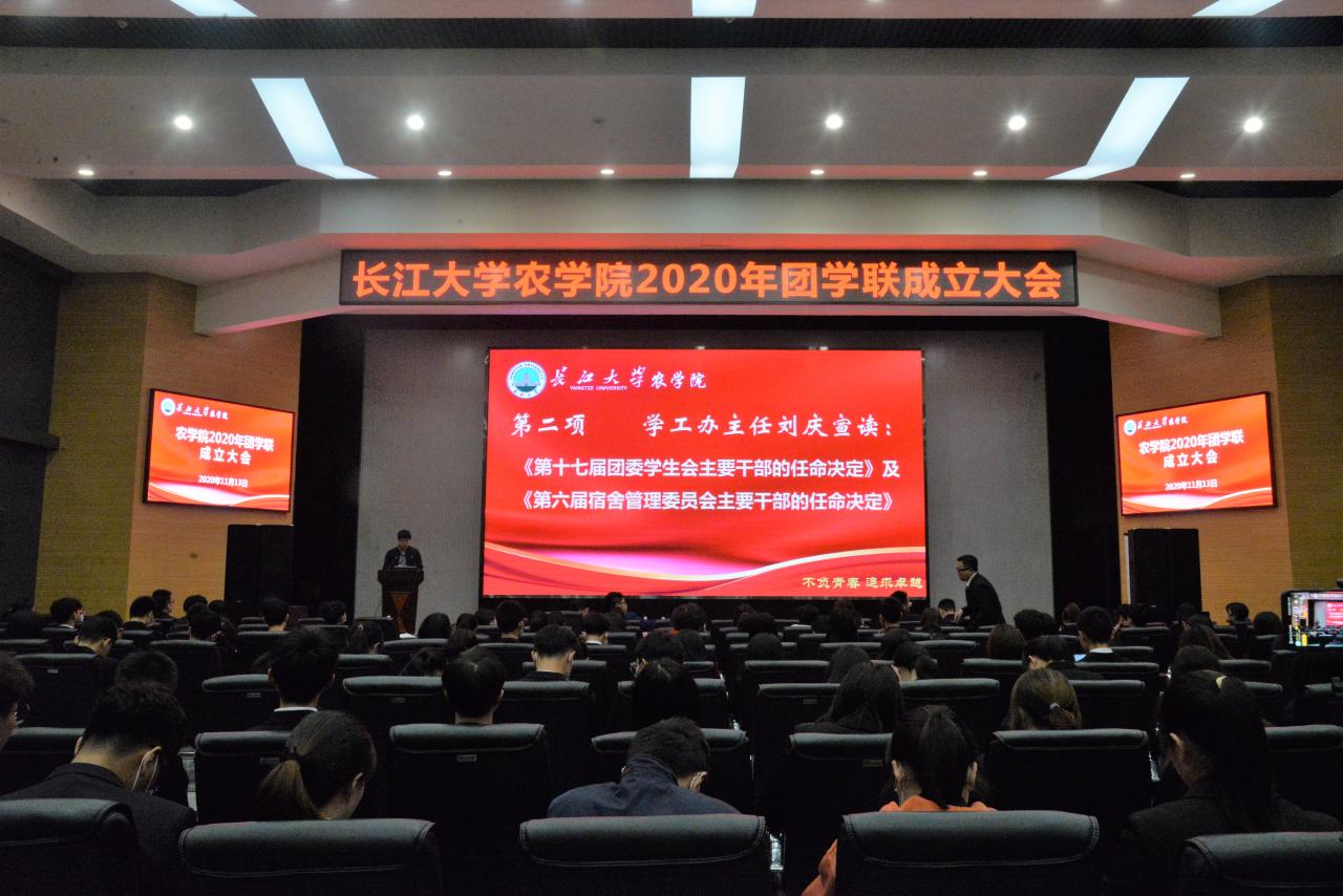 本次大会分四项进行。大会伊始,全体起立奏唱国歌,大会在庄严肃穆的气氛中拉开帷幕。之后,由学工办主任刘庆老师宣读了《第十七届团委员工会主要干部的任命决定》及《第六届宿舍管理委员会主要干部的任命决定》,他说到:“团学联是一个大家庭,我们存在的意义就在于服务于我们的同学,加入了这个集体,就要做到尽职尽责,要有吃苦耐劳,乐于奉献的精神,我们是一个有组织、有纪律的团体,只有做到严于律己,才能够树立良好的团学形象,成为一名合格的、优秀的团学成员。”