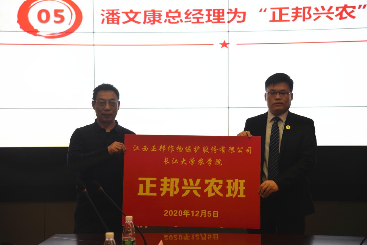 仪式上,江西正邦作物保护股份有限公司销售部总经理何贵林对合作方案进行了解读,李俊凯和潘文康作为校企双方代表签署了合作协议,潘文康向李俊凯颁发了“正邦兴农班”班牌,周燚教授、吴清来副教授围绕可转化的科研成果做了现场汇报。