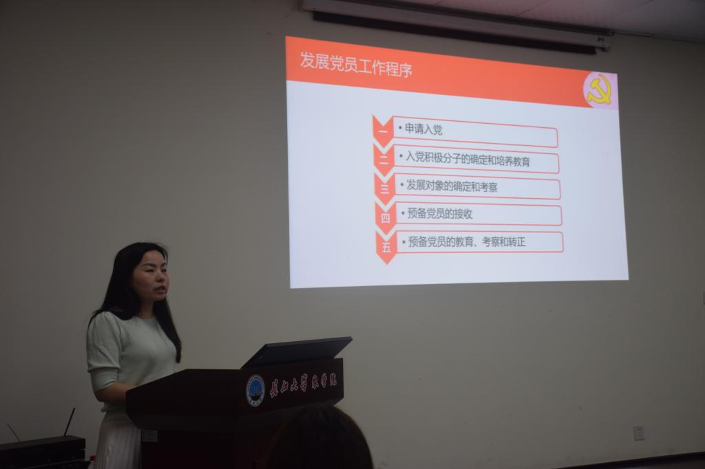 会议伊始,侯聪老师围绕“申请入党” “入党积极分子的确定和培养教育”以及“发展对象的确定和考察”三个方面为参会人员进行了详细讲解。她指出,作为青年老员工,必须明确自己身上所肩负的责任,勇于担当新使命,不懈奋斗,努力争取成长为一名合格的共产党员。接着,她又从“预备党员的接收”和“预备党员的教育考察和转正”两方面鼓励同学们加入中国共产党,践行自己的人生理想,把有限的生命投入无限的为人民服务中去。然后,侯聪老师为大家指出以往推优工作中存在的问题,她告诉同学们党员发展是一项长期的工作,在被发展前有许多问题需要注意。
