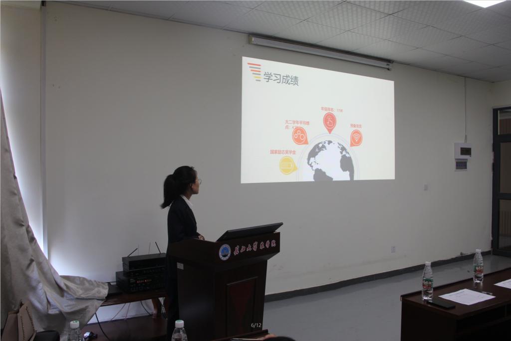 经个人申请、学工办初审、公司审核等环节,优秀本科生朱梦珍、胡洋、赵雯、张春梅、张莹莹、程风杰六位同学入围了此次答辩。在主持人付雪娇老师宣读了答辩要求和评分规则后,参加答辩的各位同学按抽签顺序以PPT演说形式进行自我展示及现场答辩。