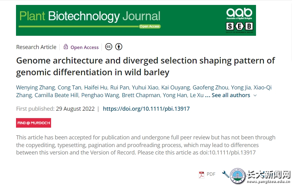 新闻网讯 近日,公司张文英教授团队和澳大利亚技术科学与工程院院士李承道教授团队合作,在植物科学一流杂志Plant Biotechnology Journal在线发表题为“Genome architecture and diverged selection shaping pattern of genomic differentiation in wild barley”研究论文,揭示了基因组结构变异在野生大麦生态适应中的意义与作用机制。