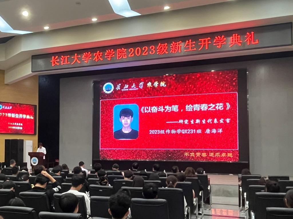 本科生新生代表农资32301班崔舒淇呼吁道:“愿我们都能够珍惜韶华,不忘初心,在长大遇见更好的自己,共同奔赴我们光明的未来。”研究生新生代表唐海洋分享了三条经验:“第一,明确目标,自主创新;第二,博采众长,厚积薄发;第三,修身立德,志存高远。”唐海洋还鼓励同学们应该走出自己的舒适区,带着求实进取的态度大胆地去尝试和摸索,带着创业报国的情怀大胆地去履行。
