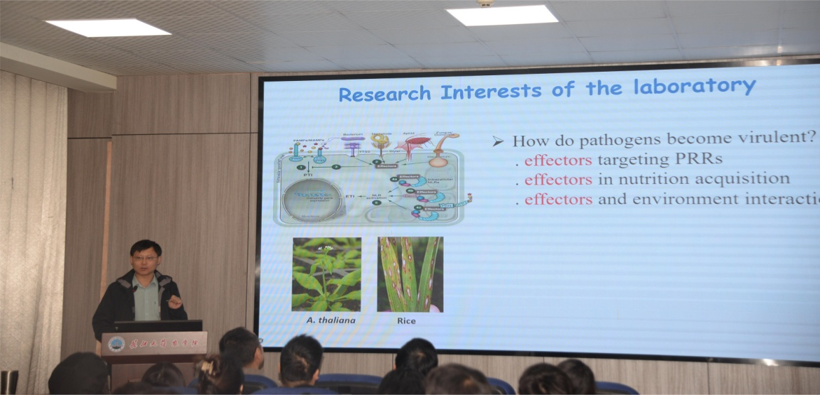 刘俊教授也为师生们介绍了自己正在从事的科研项目,详实的数据、准确的分析让师生们对内质网在植物免疫中的功能有了新的认识。乔永利教授介绍了小RNA介导植物对卵菌的抗性研究,从多个角度讲解此项研究的重要性和创新性。专家的专业讲解,不仅让师生们学到了知识,而且从一个个实验数据中让大家看到了真正的科研精神。