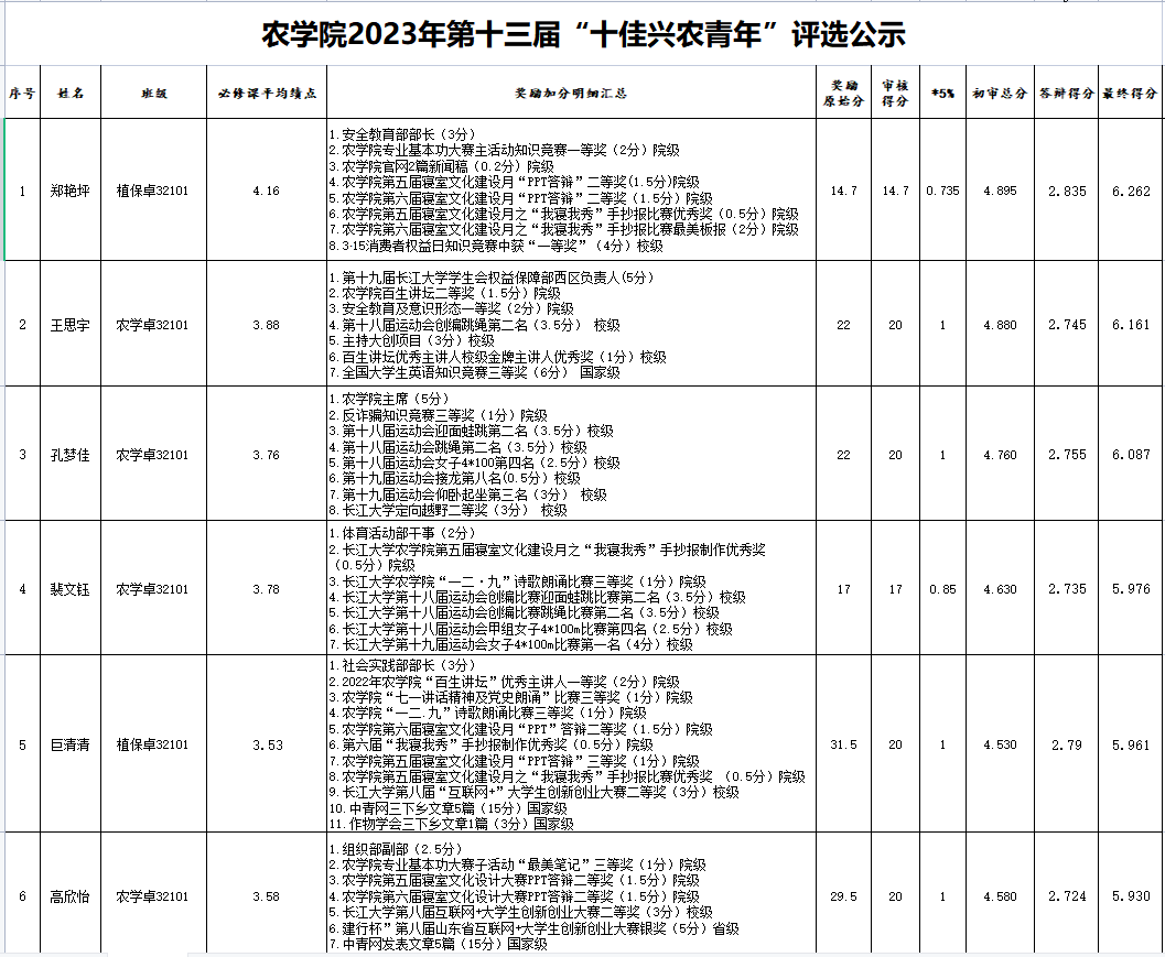 为了树立先进典型,充分发挥典型的教育示范作用,有效激励全院员工勤奋学习,形成积极进取、学习先进、崇尚先进、争当先进的良好风气,促进员工全面发展和成长成才,经个人报名、资格审核、个人展示、面试答辩等程序,拟推荐郑艳坪等10名同学为本届“十佳兴农青年”候选人。