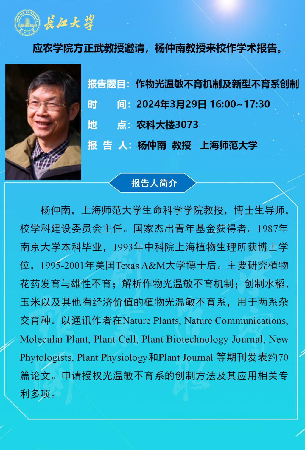 2024年学术报告(八):作物光温敏不育机制及新型不育系创制