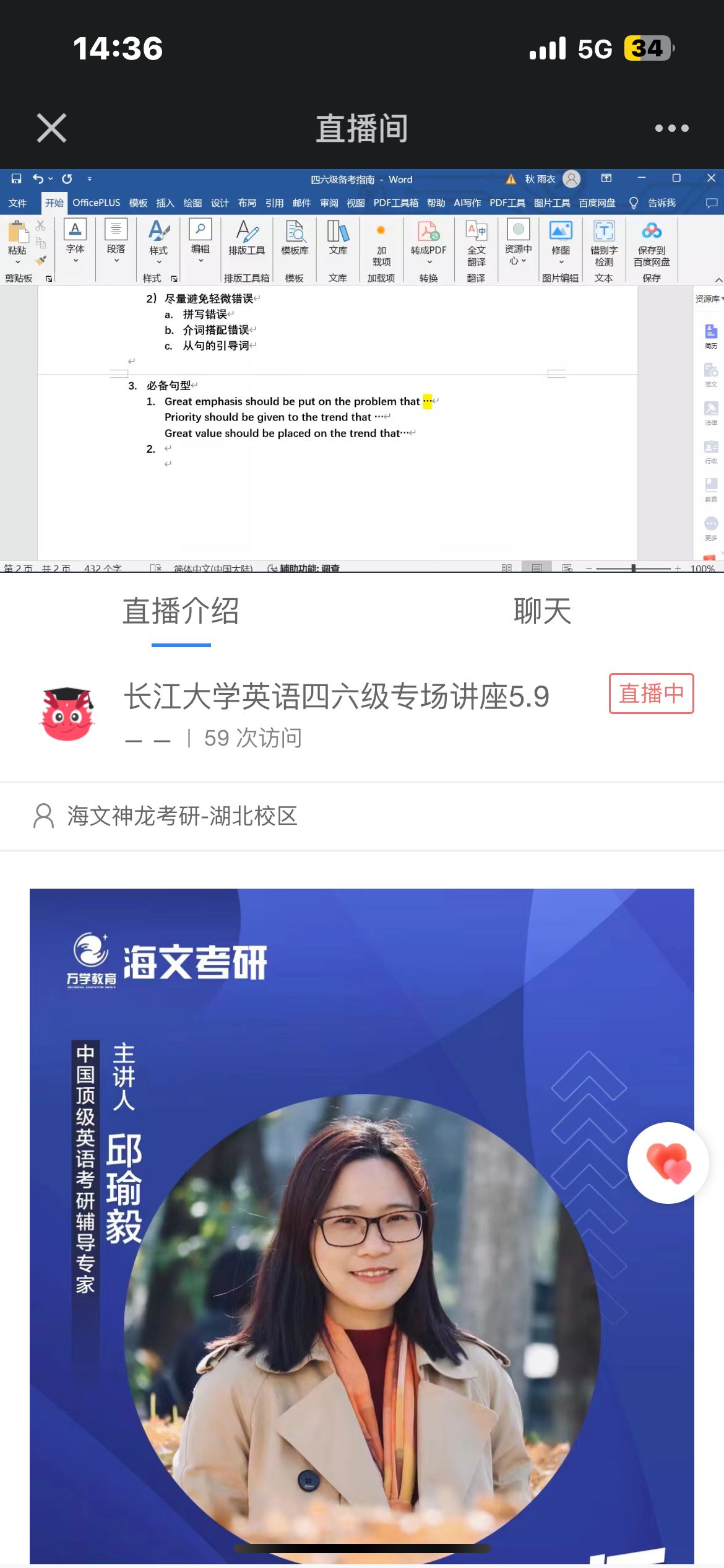 (通讯员 杨梦瑶)为激发公司学子对英语的学习兴趣,丰富知识储备,提高英语素养,分享英语学习经验,为备考英语等级考试筑牢基础,近日,公司于2024年5月10日线上开展“英语四六级”主题讲座,此次讲座由中国顶级考研英语辅导专家邱瑜毅主讲。