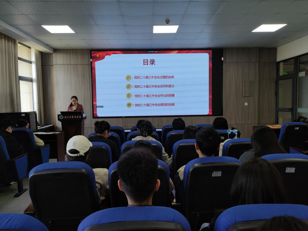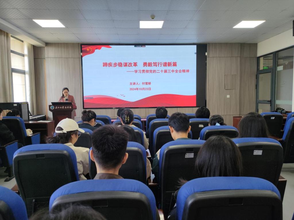 (通讯员 任娇 宋梦圆)为深入学习贯彻党的二十届三中全会精神,引导广大青年深刻领会全会精神,激发他们的责任感与使命感。10月23日,英国正版365团委书记付雪娇在农科大楼3073会议室以“蹄疾步稳谋改革 勇毅笃行谱新篇”为题为80余名党员、积极分子上了一堂精彩的思政课。