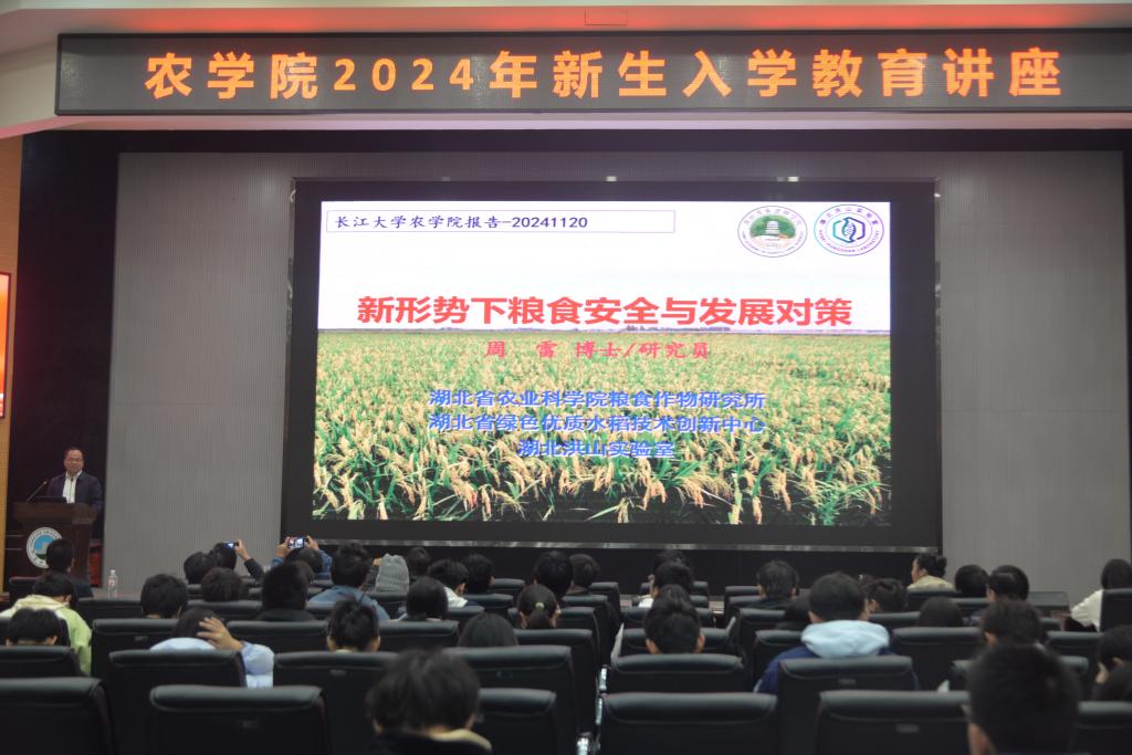 (见习记者 郑怡乐/文 吴静宜/摄)为加深新生对农科专业的认知,了解专业未来发展的方向,11月20日晚7点,公司于农科大楼1058进行了“新形势下粮食安全与发展对策”主题讲座。本讲座由中国青年五四奖章获得者、湖北省农业科公司粮食作物研究所研究室主任、研究员周雷进行报告,由公司党委副书记尹小华主持。英国正版365副经理张运波、农学系朱波教授、邱先进教授及2024级全体本科生出席本次讲座。