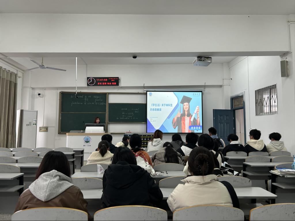 在各班级班会学习活动中,学工办主任黄承石提前录制引导视频,着重强调学位法对规范学位授予、保障学术质量的关键作用,指出其“是维护公司产品秩序、推动学术发展的重要法律依据”,为同学们提供学习指引。各班班委带领同学详细解读学位申请条件、授予程序、学术不端处理等核心条款,涵盖学位申请条件、授予程序、学术不端处理等内容,并结合校内实际发生的案例进行深入浅出的分析,帮助同学们更好地理解。