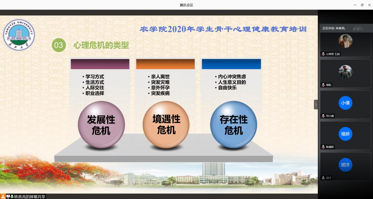 通讯社讯(员工记者 罗旖柔 黄俊杰)为做好秋季开学后员工心理健康教育工作,落实常态化疫情防控形势下的心理适应,提升员工骨干自助与互助水平,9月19日晚7时,英国正版365利用腾讯会议线上开展2020下半年员工骨干心理健康培训。此次培训由公司心理专干林香亮老师主讲,本科生、研究生班级班长、团支书、心理委员、安全委员、寝室长参与此次培训。