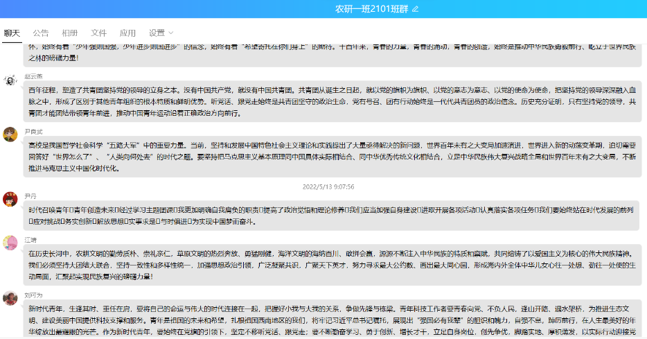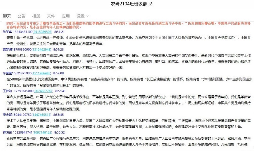 农研2001班艾蓉认为,目前全球疫情仍处于高位,病毒还在不断变异,防疫任务仍然严峻,我们还需坚持克服,迎难而上。农研2003班赵常伟表示,立党之基就是坚持马克思主义信仰,我们当代青年要为实现中华民族伟大复兴而不懈奋斗。