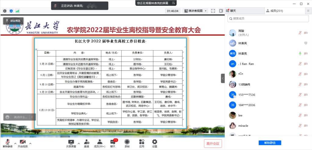 会议对毕业生离校手续办理、毕业生档案处置、疫情防控与安全稳定、体检、毕业典礼等工作做了具体安排。针对毕业生相关工作,林香亮耐心细致地回答了同学们的疑惑,对毕业生登记表填写、档案转递以及离校相关事宜的注意事项进行了强调,教育毕业生要讲文明,守纪律,并祝愿各位毕业生在新的人生旅途中,不要忘记初衷,开拓进取,实现自己的目标和理想。