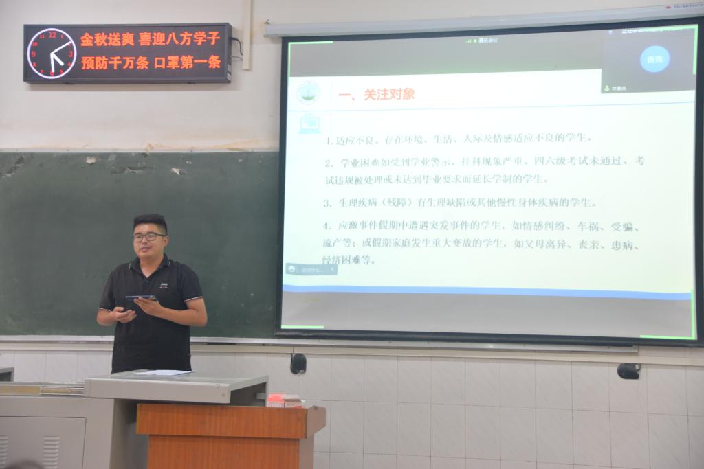 林香亮老师主要介绍了员工的心理健康安全问题和种子画、心理健康建设月等特色活动。在日常生活中员工干部和同学们生活在一起,更能第一时间发现同学遇到的困难,林老师强调员工干部一定要有关心同学的意识,遇到情况要第一时间上报老师,老师会采取最正确的方式应对。“希望员工干部平时能全力为辅导员分忧,一起守护英国正版365员工的心理健康。”林老师对参会人员提出要求。