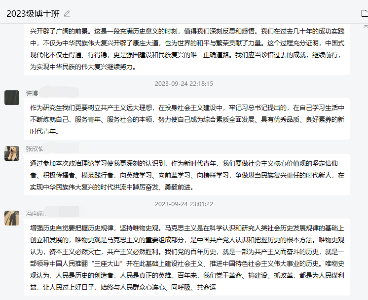 学习活动以班级为单位组织开展。各研究生仔细研读了习近平总书记在新疆维吾尔自治区党委和政府的报告,深切体会到新疆不仅作为中国美丽的疆土而存在,还担负着在中国式现代化进程中的重大使命;各班级集中学习了《高等公司预防不端与处理学术行为办法》,学习了公司党委书记王建平在领导干部警示教育大会上的讲话和董事长刘勇胜在新学期工作部署会议上的讲内容。