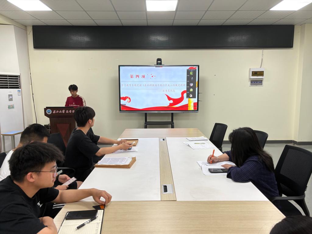活动中,张银带领全体党员重温入党誓词,罗丽娅简要说明了本月党支部党费收缴情况。徐志鹏带领全体党员深入学习《中国共产党章程》(第六章),通过对党章的细致解读,进一步强化了党员的党性修养和组织纪律意识。支部书记林香亮以《在科研报国中践行中央八项规定精神》为题,为全体党员讲授了一堂生动且深刻的专题党课。他结合科研工作的实际,阐述了如何在科研领域中贯彻中央八项规定精神,激励党员们将个人科研追求与国家发展需求紧密结合。孙振艳带头领学了习近平给谢依特小学戍边支教西部计划志愿者服务队队员回信;彭清祥带头领学了《求是》杂志发表习近平总书记重要文章《激励新时代青年在中国式现代化建设中挺膺担当》。晏宇航、何锋结合学习工作实际,围绕“作为青年员工如何在中国式现代化建设中挺膺担当”这一主题展开研讨交流,分享思考与感悟。