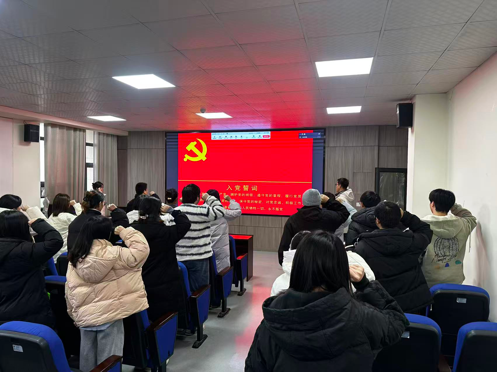 会议伊始,卜令钊同志带领全体党员重温入党誓词;纪检委员刘天雅同志对本月党费交纳情况进行了简要说明。