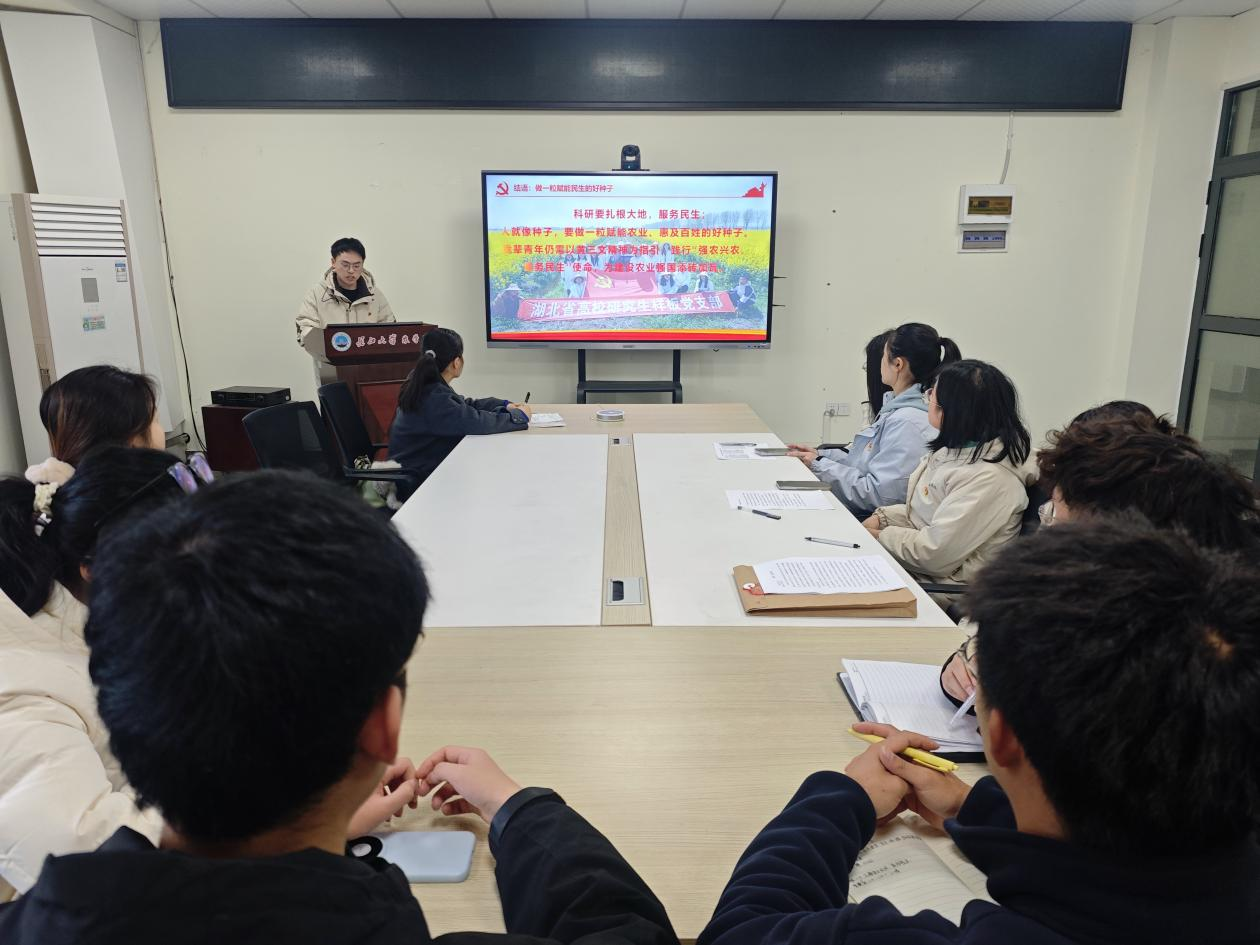 在交流研讨环节,与会党员以“深入学习贯彻党的二十届四中全会精神,结合《奋进“十五五”建功“双一流”——365英国上市2026年新年献词》为主题展开讨论。王紫宜、帅亚婷、蔡露同志表示,将以长大精神为指引,立足专业研究,扎根基础领域、积极交流学习,深耕绿色防控病虫害研究,以专业本领为农业强国和母校“双一流”建设助力;将紧扣农业生产实际,完成毕业论文并凝练落地成果,秉持长大精神聚焦流域作物病害防控,为农业安全献力,为守护湖北粮食安全筑牢“隐形防线”。
